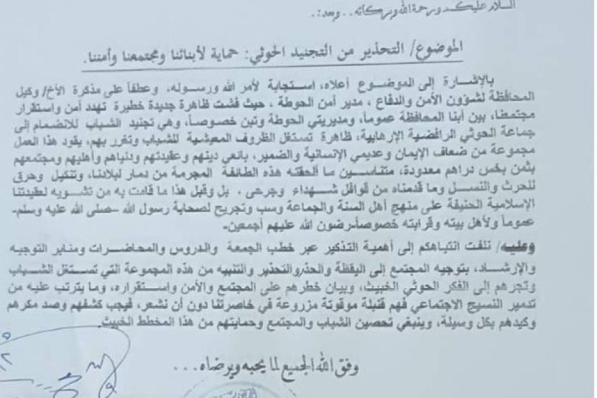 بالإشارة إلى الموضوع أعلاه ، استجابة إلى أمر الله و رسوله ، و عطفٱ على مذكرة الأخ وكيل المحافظة لشؤون الأمن و الدفاع – مدير أمن مديرية الحوطة ، حيث فشت ظاهرة جديدة خطيرة تهدد أمن و استقرار مجتمعنا ، بين أبناء المحافظة عمومٱ و مديريتي الحوطة و تُبَن خصوصٱ و هي تجنيد الشباب للانضمام إلى جماعة الحوثي الرافضية الإرهابية.