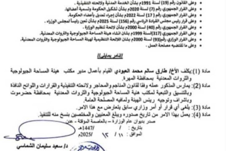 أصدر وزير النفط والمعادن الدكتور سعيد سليمان الشماسي اليوم الأربعاء الموافق 11 ديسمبر 2025، القرار الوزاري رقم (40) لسنة 2025، بشأن تكليف الأخ طارق سالم محمد العبودي بالقيام بأعمال مدير مكتب هيئة المساحة الجيولوجية والثروات المعدنية في محافظة المهرة.