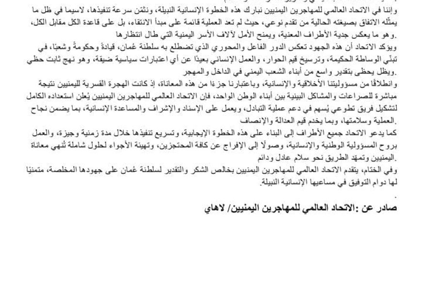 وفي ختام البيان، عبّر الاتحاد العالمي للمهاجرين اليمنيين عن خالص شكره وتقديره لسلطنة عُمان على جهودها المخلصة، متمنيًا لها دوام التوفيق في مساعيها الإنسانية النبيلة.