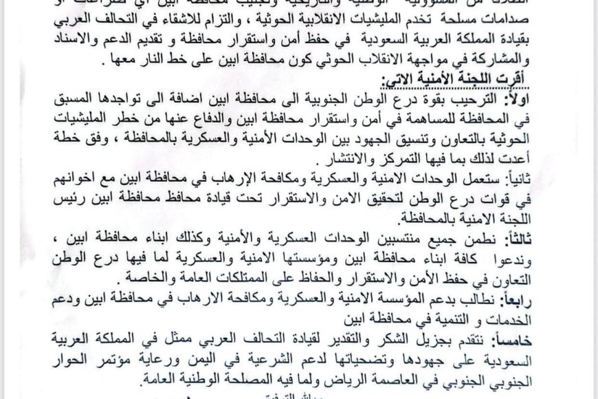 انطلاقًا من المسؤولية الوطنية والتاريخية، وتجنيب محافظة أبين أي صراعات أو صدامات مسلحة تخدم المليشيات الانقلابية الحوثية، والتزامًا مع الأشقاء في التحالف العربي بقيادة المملكة العربية السعودية في حفظ أمن واستقرار المحافظة، وتقديم الدعم والإسناد والمشاركة في مواجهة الانقلاب الحوثي، كون محافظة أبين على خط النار معها.