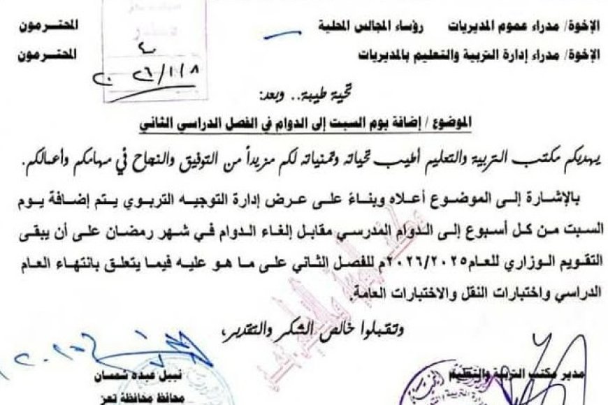 أعلن مكتب التربية والتعليم في محافظة تعز، ، إضافة يوم السبت إلى جدول الدوام المدرسي الأسبوعي خلال الفصل الدراسي الثاني، وذلك بموجب تعميم رسمي وُجّه إلى مديري المديريات ورؤساء المجالس المحلية ومديري إدارات التربية والتعليم بالمحافظة...