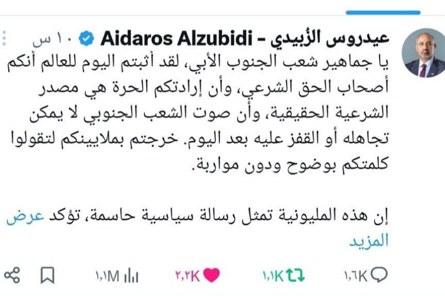 سجّلت تغريدة رئيس المجلس الانتقالي الجنوبي عيدروس قاسم الزُبيدي تفاعلاً لافتاً على منصة «إكس»، بعد أن تجاوزت 1.1 مليون مشاهدة خلال ساعة واحدة فقط من نشرها، في رقم اعتبره متابعون غير مسبوق في المشهد السياسي المحلي.